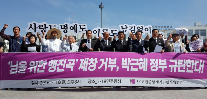 기념사업회는 "일련의 상황들을 지켜봤을 때 박근혜 정부가 국론분열의 핵이요 5·18민주화운동 기념식의 훼방꾼이다"라고 규탄하고 "박근혜 정부의 5·18민중항쟁에 대한 폄하를 극복하고 오월정신과 광주공동체를 지켜 내겠다"며 기자회견을 마무리했다.5·18기념위원회는 16일 오후 3시 광주 동구 금남로 5·18민주광장에서 기자회견을 열고 '임을 위한 행진곡' 제창을 거부한 보훈처와 박근혜 정부를 비판하는 기자회견을 열었다. <사진제공=5·18기념위원회>
