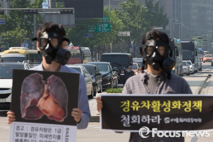 (서울=포커스뉴스) 17일 오전 서울 종로구 광화문광장 인근에서 서울환경연합원들이 경유차 활성화 정책 철회를 촉구하며 퍼포먼스를 벌이고 있다.