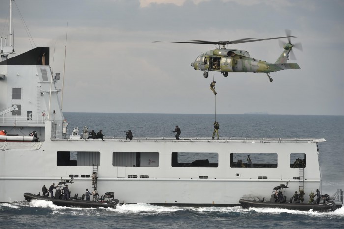 이번 훈련에서는 14개 국가 20개 팀이 싱가포르군이 사용하는 소총·권총으로 사격경연대회를 열었고, 이 대회에서 우리 군의 육·해군 특공대 합동팀이 우승을 차지하기도 했다.지난 1일~12일 브루나이와 싱가포르 일대에서 진행된 해양안보·대테러 연합훈련에서 한국 해군 특공대원들이 피랍된 선박에 진입해 인질 구출을 시도하고 있다. <사진제공=국방부>