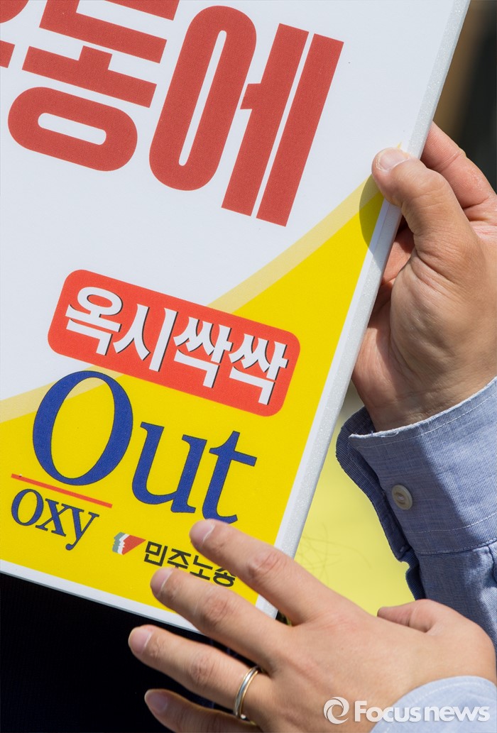 (서울=포커스뉴스) 17일 오전 서울 광화문광장에서 열린 '옥시 불매, 사업장 옥시 OUT' 선언 기자회견에 참석한 민주노총 조합원 및 가습기 살균제 피해자 가족들이 옥시를 규탄하는 손팻말을 들고 있다.