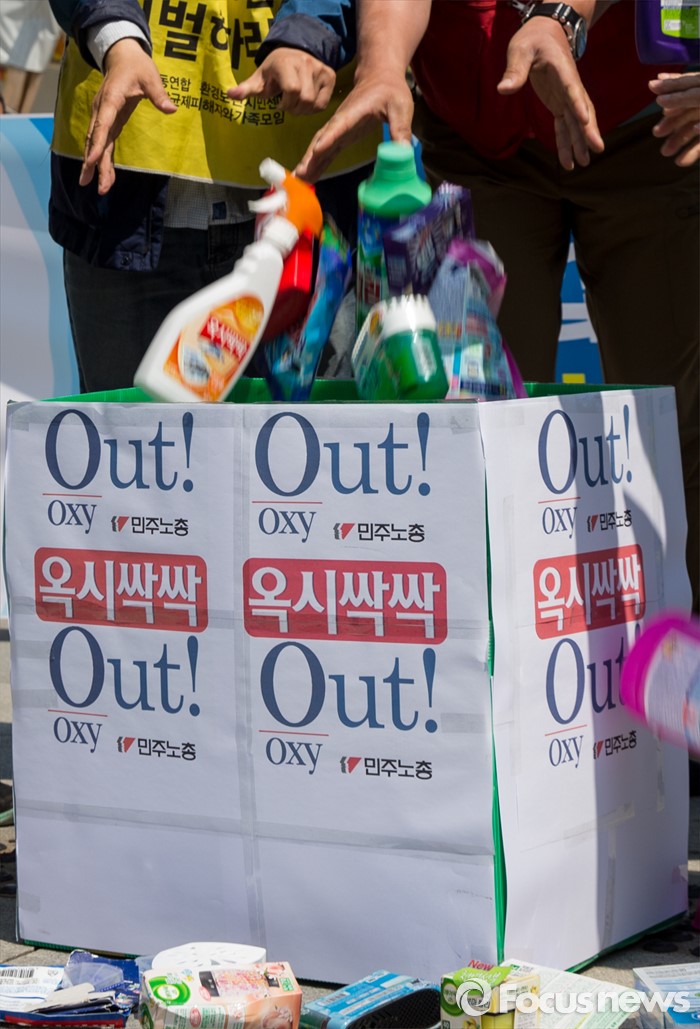 (서울=포커스뉴스) 17일 오전 서울 광화문광장에서 열린 '옥시 불매, 사업장 옥시 OUT' 선언 기자회견에 참석한 민주노총 조합원 및 가습기 살균제 피해자 가족들이 옥시를 규탄하는 퍼포먼스를 하고 있다.