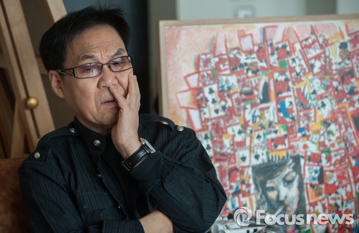 (서울=포커스뉴스) 가수겸 방송인 조영남씨가 청담동 자택에서 자신의화투그림에서 포즈를 취하고 있다. 검찰은 16일 그림 대작을 조사하기 위해 조씨의 그림을 압수수색했다.