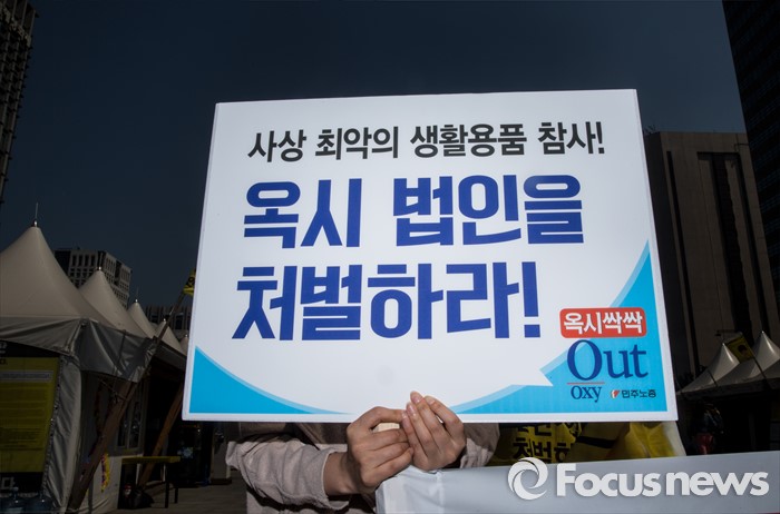 (서울=포커스뉴스) 17일 오전 서울 광화문광장에서 열린 '옥시 불매, 사업장 옥시 OUT' 선언 기자회견에 참석한 민주노총 조합원 및 가습기 살균제 피해자 가족들이 옥시를 규탄하는 손팻말을 들고 있다.