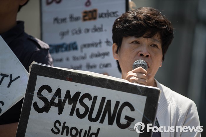 (서울=포커스뉴스) 17일 오전 서울 서초구 서초동 삼성전자 서초사옥 앞 반올림 농성장에서 반올림 관계자들이 삼성직업병 문제 올바른 해결을 촉구하는 반올림 기자회견을 하고 있다.