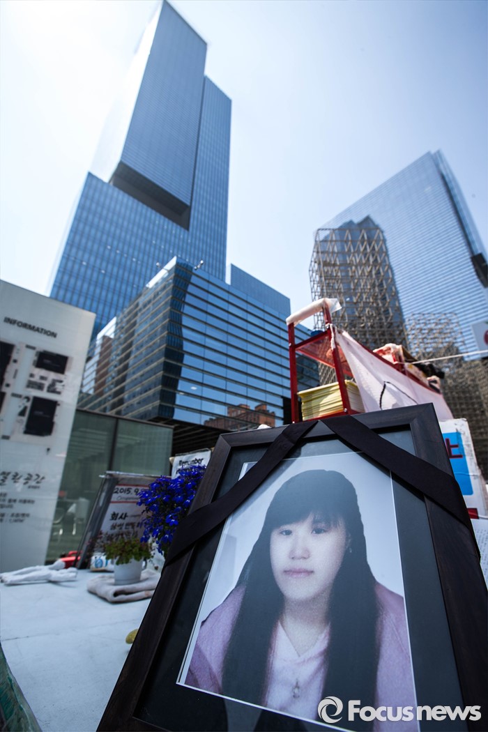 (서울=포커스뉴스) 17일 오전 서울 서초구 서초동 삼성전자 서초사옥 앞 반올림 농성장에서 열린삼성직업병 문제 올바른 해결을 촉구하는 반올림 기자회견장 옆에 삼성반도체 사업장에서 근무하다 백혈병으로 사망한 황유미씨의 사진이 놓여 있다.