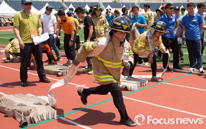 (서울=포커스뉴스) 17일 오전 서울 양천구 목동운동장에서 열린 2016 의용소방대 종합소방기술경연대회에서 한 참가자가 소방호스 끌기 경기 중 부정 출발을 하고 있다.