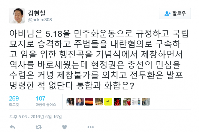 김 교수는 이날 오전 자신의 트위터에 올린 글에서 이같이 밝히며 "아버님은 5.18을 민주화운동으로 규정하고 국립묘지로 승격했다"며 "주범들을 내란혐의로 구속하고 임을 위한 행진곡을 기념식에서 제창하면서 역사를 바로세웠다"고 말했다.