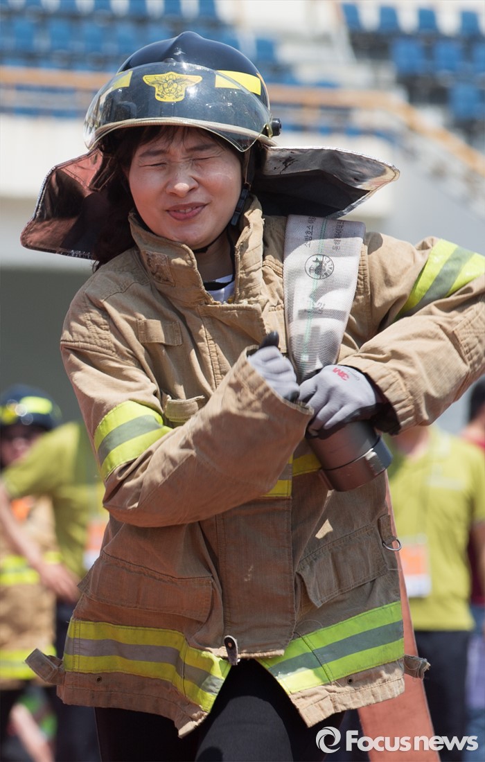 (서울=포커스뉴스) 17일 오전 서울 양천구 목동운동장에서 열린 2016 의용소방대 종합소방기술경연대회에서 참가자들이 소방호스 끌기 경기를 하고 있다.