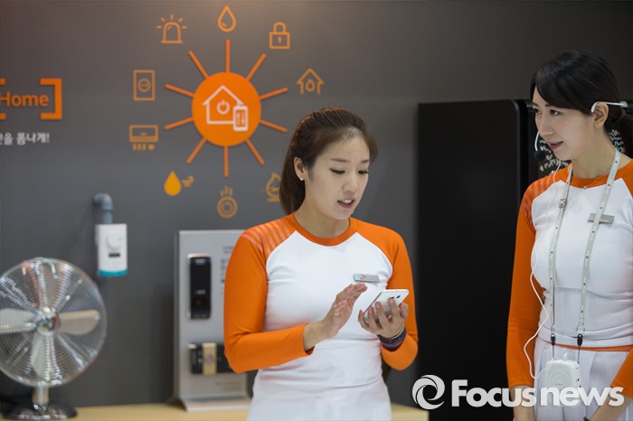 (서울=포커스뉴스) 17일 오전 서울 강남구 코엑스에서 열린 '월드 IT쇼 2016' 의 SK텔레콤 부스에서 직원들이 휴대전화를 이용해 가전제품을 제어하는 시범을 보이고 있다.