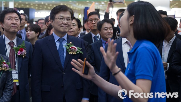 (서울=포커스뉴스) 17일 오전 서울 강남구 코엑스에서 열린 '월드 IT쇼 2016' 에 참석한 최양희 미래창조과학부 장관이 관련설명을 듣고 있다.