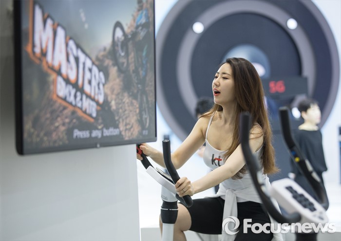 (서울=포커스뉴스) 17일 오전 서울 강남구 코엑스에서 열린 '월드 IT쇼 2016' 에 KT부스의 한 도우미가 가상현실을 기반으로한 자전거 운동 서비스를 체험하고 있다.