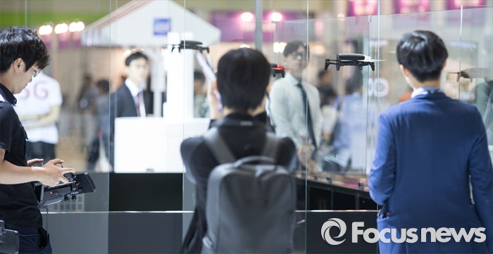 (서울=포커스뉴스) 17일 오전 서울 강남구 코엑스에서 열린 '월드 IT쇼 2016' 의 KT부스를 찾은 관람객들이 실시간 방송용 드론들을 바라보고 있다.