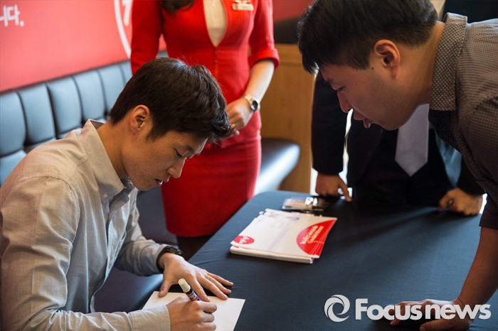 (서울=포커스뉴스) 17일 오후 서울 서대문구 탐앤탐스 신촌로터리점에서 열린 '에어아시아 앰배서더 박지성 사인회'에 참석한 박지성 前 국가대표 축구선수가 한 팬에게 사인을 해주고 있다.