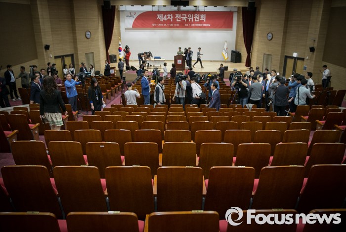 (서울=포커스뉴스) 17일 오후 서울 여의도 국회 의원회관에서 비대위 구성안 및 당헌 당규개정안 등 현안 처리를 위해 예정된 4차 새누리당 전국위원회가 무산된 후 상임고문단 등 참석자들이 퇴장해 빈 자리만 보이고 있다. 이날 전국위원회의는 앞서 예정된 상임전국위원회를 개최해 당헌개정안 등을 심의할 예정이었지만, 친박계 의원들이 대거 불참해 참석자 미달로 회의가 열리지 못 했다.