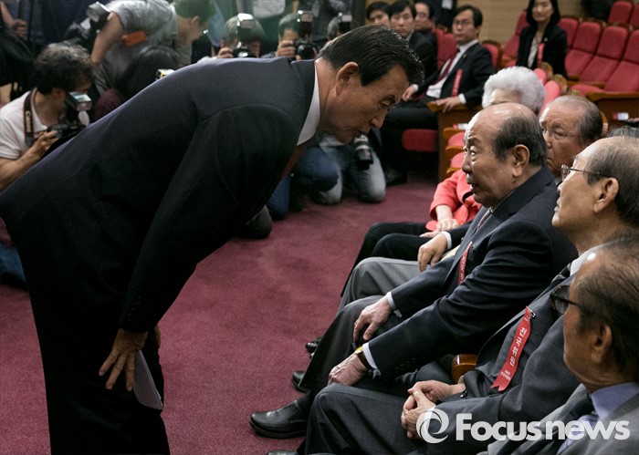 (서울=포커스뉴스) 17일 오후 서울 여의도 국회 의원회관에서 비대위 구성안 및 당헌 당규개정안 등 현안 처리를 위해 예정된 4차 새누리당 전국위원회에 참석한 홍문표(왼쪽) 사무총장 대행과 김수한 상임고문이 대화하고 있다. 이날 전국위원회의는 앞서 예정된 상임전국위원회를 개최해 당헌개정안 등을 심의할 예정이었지만, 친박계 의원들이 대거 불참해 참석자 미달로 회의가 열리지 못 했다.