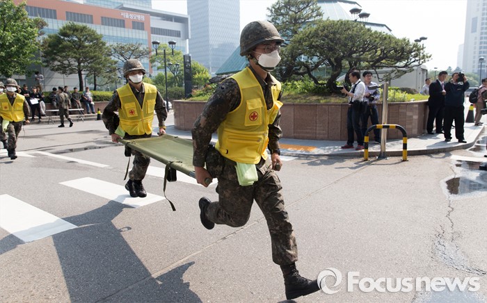 (서울=포커스뉴스) 17일 오후 서울 서초구 JW메리어트호텔 서울에서 민·관·군 관계자들이 2016 재난대응 안전한국훈련을 하고 있다.