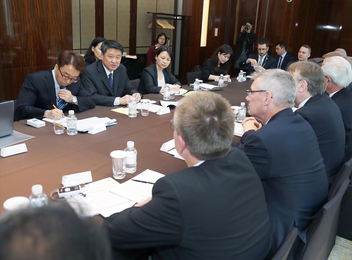 (서울=포커스뉴스) 김학도 산업통상자원부 통상교섭실장이 17일 오후 서울 웨스틴 조선호텔 로즈룸에서 한-EU FTA 발효 5주년 평가를 위해 방한중인 베른트 랑에(Bernd LANGE, 사회당 소속) 유럽의회 국제통상위 의장을 비롯한 8명의 국제통상위 위원의 예방을 받고, 한-EU FTA를 포함한 양측 통상정책과 한국의 향후 FTA 추진방향 등에 관해 의견을 교환하고 있다. <사진제공=산업통상자원부>