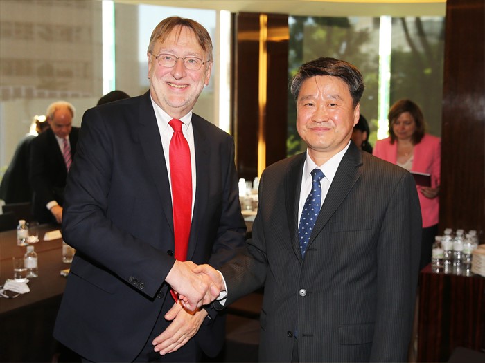 (서울=포커스뉴스) 김학도 산업통상자원부 통상교섭실장이 17일 오후 서울 웨스틴 조선호텔 로즈룸에서 한-EU FTA 발효 5주년 평가를 위해 방한중인 베른트 랑에(Bernd LANGE, 사회당 소속) 유럽의회 국제통상위 의장과 회의에 앞서 악수를 하고 있다. <사진제공=산업통상자원부>