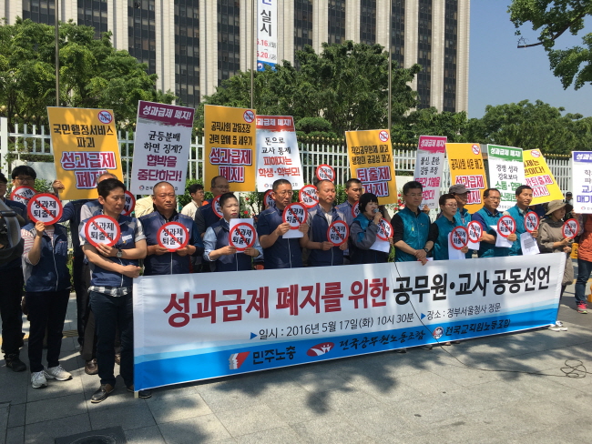 (서울=포커스뉴스) 공무원과 교사들이 성과연봉제 도입을 강행하는 정부에 맞서 성과급제 분배 투쟁을 예고했다.