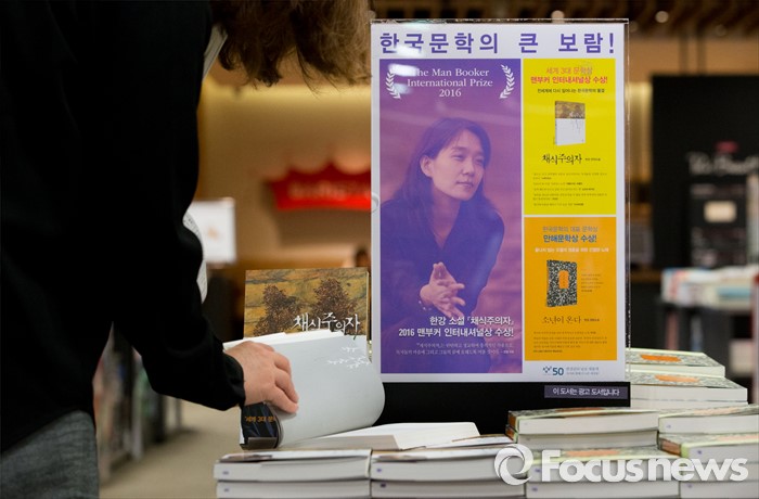 (서울=포커스뉴스) 소설가 한강의 '채식주의자'가 맨부커 인터내셔널상 수상 후 판매량이 급증하고 있다. 17일 오후 서울 서초구 교보문고 강남점에서 독자들이 채식주의자를 살펴보고 있다.