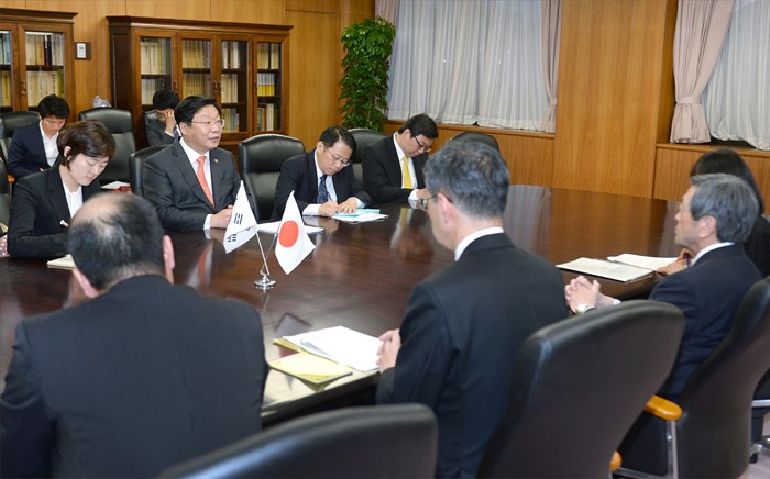 (서울=포커스뉴스) 주형환 산업통상자원부 장관이 17일 오후 일본 동경 경제산업성 집무실에서 하야시 모토오(林幹雄) 경제산업성 대신과 면담을 갖고, 한일 양국간 통상협력과 통상장관채널 정례화 등 양국의 통상현안을 주제로 의견을 교환하고 있다. <사진제공=산업통상자원부>