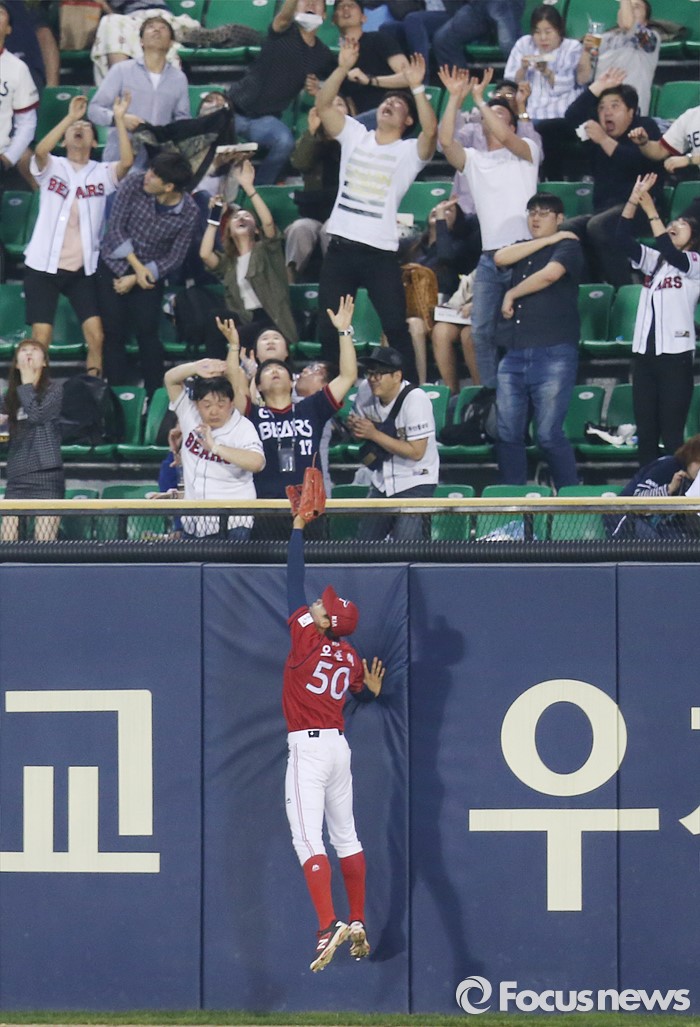 (서울=포커스뉴스) 17일 서울 잠실구장에서 열린 2016프로야구 KIA-두산 경기 4회말 2사후 KIA 우익수 오준혁이 두산 김재환의 홈런 타구를 잡으려 펜스를 잡고 뛰어 오르고 있다.