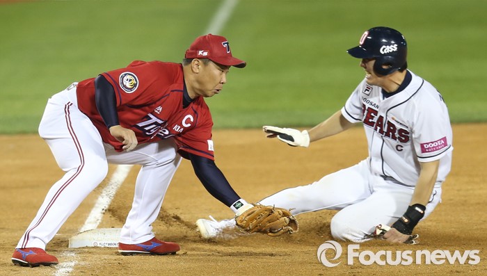 (서울=포커스뉴스) 17일 서울 잠실구장에서 열린 2016프로야구 KIA-두산 경기 7회말 1사 1,2루에서 두산 2루주자 김재호가 도루를 시도, 3루로 슬라이딩하며 세이프되고 있다. KIA 3루수는 이범호.