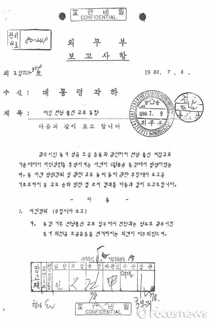 17일 <포커스뉴스>는 외교부가 지난 4월 공개한 25만여 쪽에 달하는 외교비밀문서를 정밀 분석, 5·18민주화운동 직후인 1980년 6월 당시 외무부가 해외교포들의 동향을 담은 다수의 비밀문서를 청와대에 보고한 사실을 확인했다.