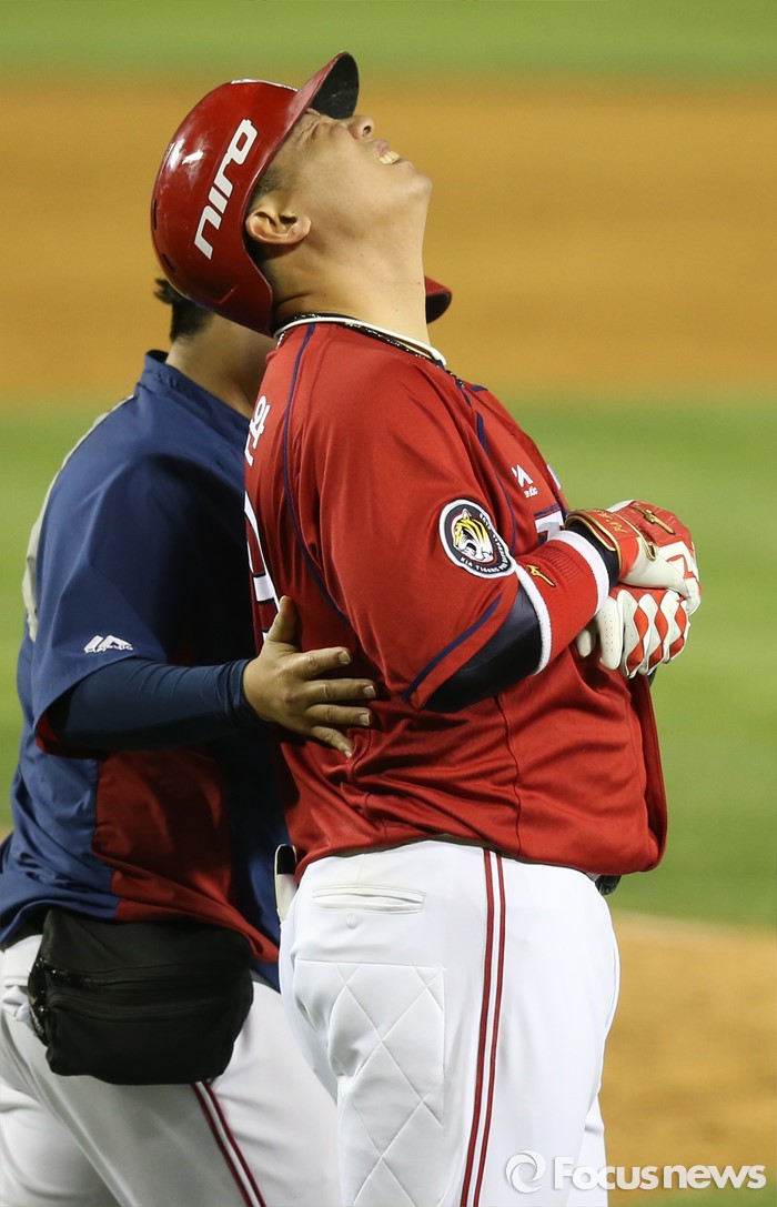 (서울=포커스뉴스) 17일 서울 잠실구장에서 열린 2016프로야구 KIA-두산 경기에서 8회초 KIA 나지완이 두산 정재훈의 투구에 왼손을 맞고 고통스러워하고 있다.