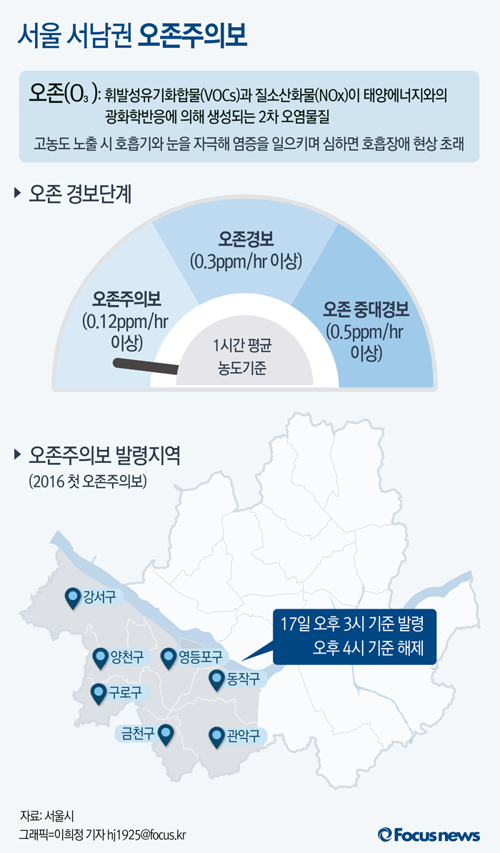 (서울=포커스뉴스) 17일 서울시는 서남권 지역 7개구(양천구, 강서구,구로구, 금천구, 영등포구, 동작구, 관악구)에 올해 첫 오존주의보를 발령했다. 오존주의보는 한 시간 뒤인 오후 4시를 기준으로 해제됐다.