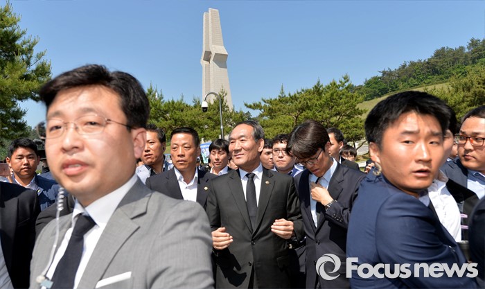 (광주=포커스뉴스) 36주년 5·18민주화운동 기념식이 거행된 18일 오전 광주 북구 운정동 5·18민주묘지에서 행사장에 참석하려는 박승춘 보훈처장이 5월 유가족의 항의를 받고 기념식장을 떠나고 있다.