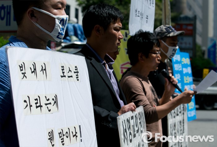 (서울=포커스뉴스) 18일 오전 서울 여의도 더불어민주당사 앞에서 사법시험 존치를 위한 고시생모임이 사시존치 법안의 법제사법위원회 전체회의 상정을 가로막은 더불어민주당 규탄시위를 하고 있다.