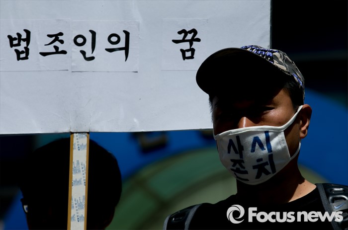 (서울=포커스뉴스) 18일 오전 서울 여의도 더불어민주당사 앞에서 사법시험 존치를 위한 고시생모임이 사시존치 법안의 법제사법위원회 전체회의 상정을 가로막은 더불어민주당 규탄시위를 하고 있다.