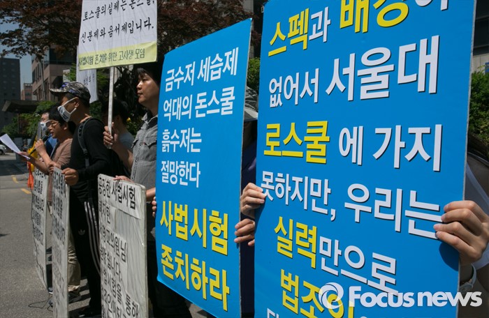 (서울=포커스뉴스) 18일 오전 서울 여의도 더불어민주당사 앞에서 사법시험 존치를 위한 고시생모임이 사시존치 법안의 법제사법위원회 전체회의 상정을 가로막은 더불어민주당 규탄시위를 하고 있다.