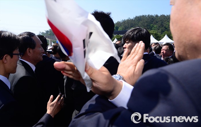 (광주=포커스뉴스) 36주년 5·18민주화운동 기념식이 거행된 18일 오전 광주 북구 운정동 5·18민주묘지에서 행사장에 참석하려는 박승춘 보훈처장이 5월 유가족의 항의를 받고 기념식장을 떠나고 있다.