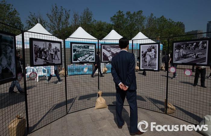 (서울=포커스뉴스) 18일 오전 서울 중구 서울시청 앞 광장에서 5.18 민주화운동 기념식이 열린 가운데 한 시민이 5.18 당시의 사진을 바라보고 있다.
