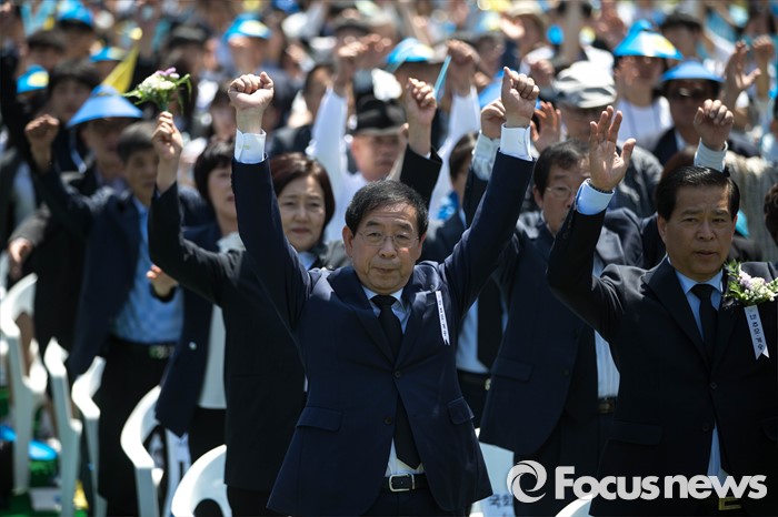 (서울=포커스뉴스) 18일 오전 서울 중구 서울시청 앞 광장에서 열린 5.18 민주화운동 기념식에 참석한 박원순 서울시장이 참석자들과 함께 만세삼창을 하고 있다.