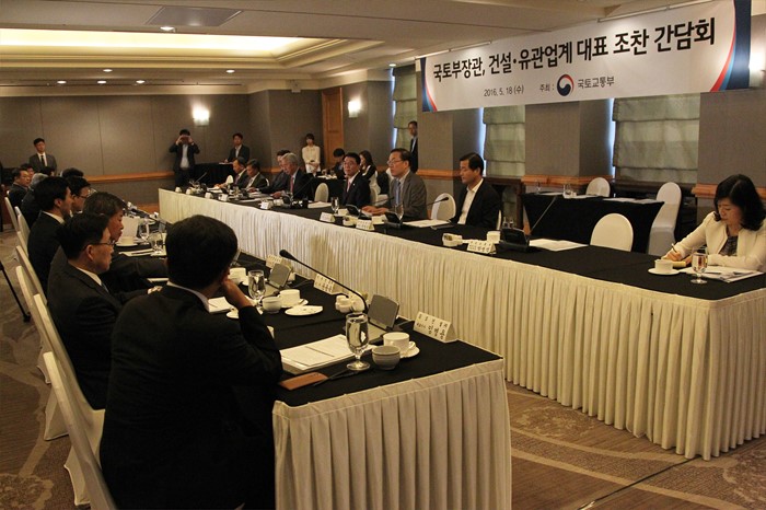 (서울=포커스뉴스) 강호인 국토교통부 장관이 18일 오전 서울 JW 메리어트 호텔에서 금번 대통령 이란 순방 시 경제사절단으로 참여한 이란 진출 건설․유관업계 대표와 간담회를 갖고 기업인들을 격려하는 한편 순방 후속조치 방안에 대해 논의학 있다. <사진제공=국토교통부>