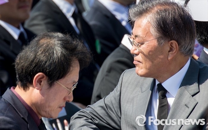 (광주=포커스뉴스) 36주년 5·18민주화운동 기념식이 거행된 18일 오전 광주 북구 운정동 5·18민주묘지에서 문재인 더불어민주당 전 대표와 조희연 서울시교육감이 생각에 잠겨 있다.