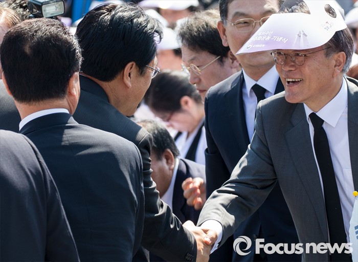 (광주=포커스뉴스) 36주년 5·18민주화운동 기념식이 거행된 18일 오전 광주 북구 운정동 5·18민주묘지에서 정진석(왼쪽) 새누리당 원내대표와 문재인 더불어민주당 전 대표가 악수하고 있다.