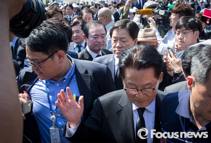 (광주=포커스뉴스) 36주년 5·18민주화운동 기념식이 거행된 18일 오전 광주 북구 운정동 5·18민주묘지에서 박지원 국민의당 원내대표가 한 참가자의 항의를 피해 발걸음을 옮기고 있다.