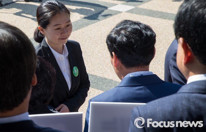 (광주=포커스뉴스) 36주년 5·18민주화운동 기념식이 거행된 18일 오전 광주 북구 운정동 5·18민주묘지 민주의문 앞에서 권은희 국민의당 당선자가 광주시의원들과 인사하고 있다.