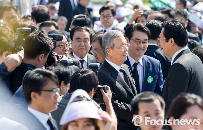 (광주=포커스뉴스) 36주년 5·18민주화운동 기념식이 거행된 18일 오전 광주 북구 운정동 5·18민주묘지에서 정진석(오른쪽) 새누리당 원내대표와 김종인 더불어민주당 비대위 대표가 악수하고 있다.
