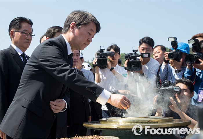 (광주=포커스뉴스) 36주년 5·18민주화운동 기념식이 거행된 18일 오전 광주 북구 운정동 5·18민주묘지에서 안철수 국민의당 상임공동대표가 기념식을 마친 뒤 분향하고 있다.