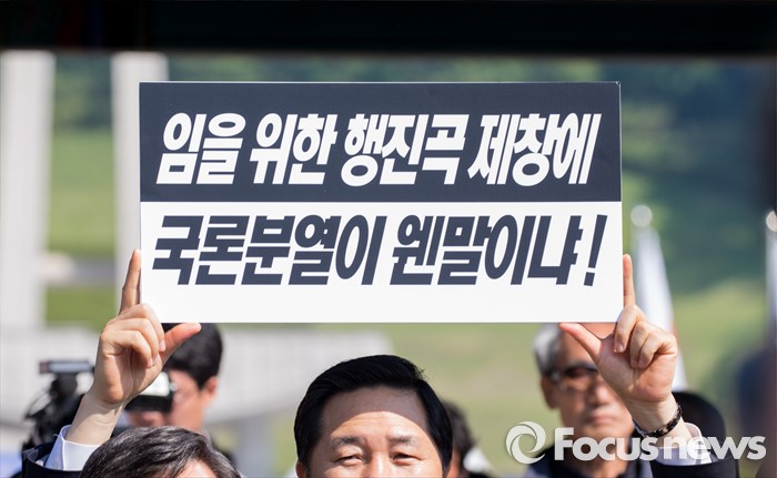 (광주=포커스뉴스) 36주년 5·18민주화운동 기념식이 거행된 18일 오전 광주 북구 운정동 5·18민주묘지 민주의문 앞에서 광주광역시의원들이 '임을 위한 행진곡' 기념곡 지정 및 제창을 요구하는 손팻말을 들고 있다.