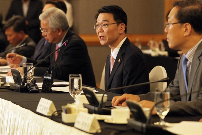 (서울=포커스뉴스) 강호인 국토교통부 장관이 18일 오전 서울 JW 메리어트 호텔에서 금번 대통령 이란 순방 시 경제사절단으로 참여한 이란 진출 건설․유관업계 대표와 간담회를 갖고 기업인들을 격려하는 한편 순방 후속조치 방안에 대해 논의학 있다. <사진제공=국토교통부>