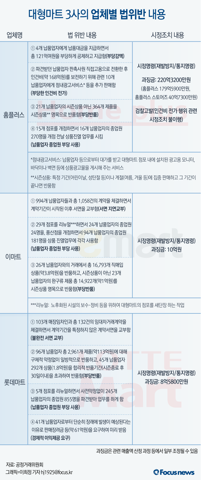 (서울=포커스뉴스) 18일 공정거래위원회는 대규모유통업법을 위반한 홈플러스와 홈플러스 스토어즈에 대해 시정명령 및 과징금 총 220억3200만원을 부과한다고 밝혔다. 공정위는 홈플러스 외에도 이마트와 롯데마트에 대해 각각 10억원, 8억5800만원을 처벌키로 했다.