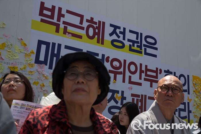 (서울=포커스뉴스) 18일 오후 서울 종로구 옛 일본대사관 앞에서 '제1231차 일본군 위안부 문제해결을 위한 정기 수요시위'가 열리고 있다.