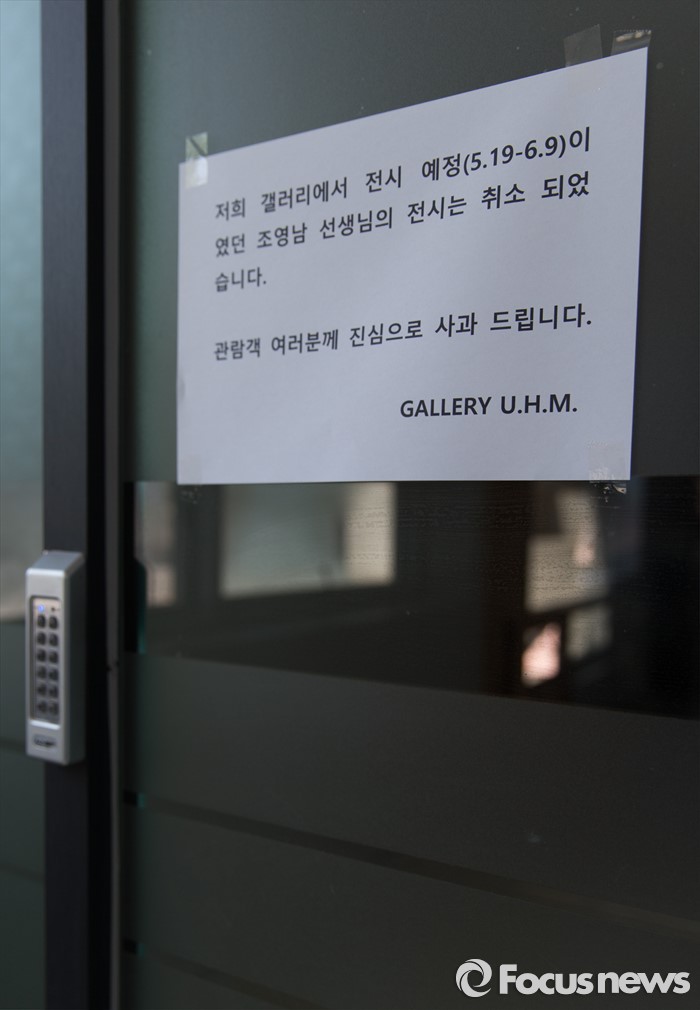 (서울=포커스뉴스) 18일 오후 서울 용산구 갤러리 U.H.M 입구에 조영남 전시회 취소 안내문이 붙어있다. 조영남은 무명화가 A씨가 지난 8년간 조영남의 그림 300여점을 대신 그렸다는 대작 의혹을 제기하면서 검찰의 압수수색을 받은 것으로 알려졌다.