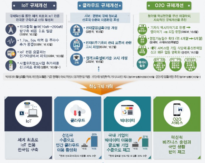 미래창조과학부는 18일에 개최된 대통령 주재의 제5차 규제개혁장관회의에서 관계 부처 합동으로 ‘정보통신기술(ICT) 융합 신산업 규제혁신’ 방안을 발표했다. 이번 대책은 지능정보기술 분야의 핵심규제를 개혁하는 데에 초점을 두고, IoT·클라우드·빅데이터는 물론 O2O 서비스의 분야별 규제혁신 방안을 마련했다.